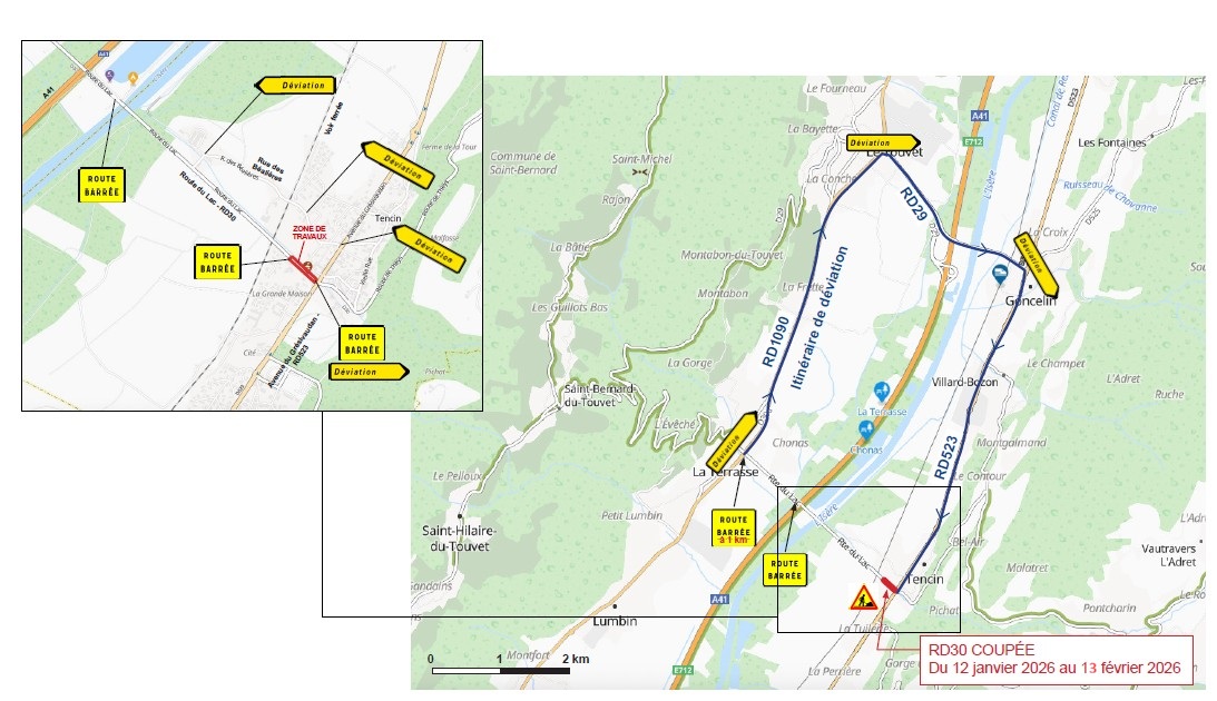 Du 12 janvier au 13 février la route départementale 30 (route du Lac) sera fermée à la circulation pour des travaux de réfection de voirie et trottoirs dans le cadre du projet cœur de village